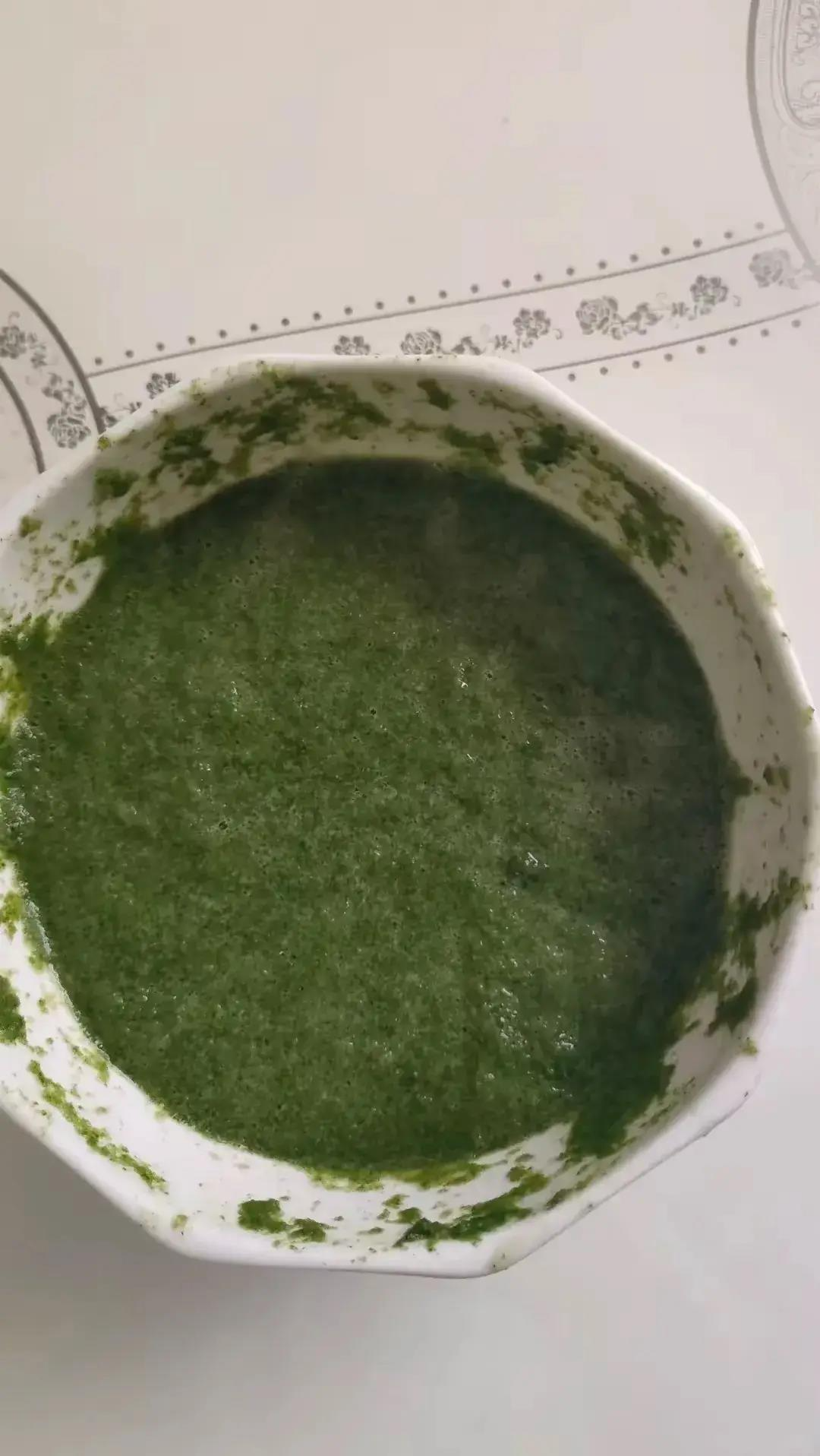 2. 把沥干的马齿苋放进蒜臼子(没有的话用辅食机打也行,别打得太稀,要有点颗粒感),分多次加晾好的黄芪水,边加边捣,直到捣成黏糊糊的泥状——不用太细,有点小碎叶反而能敷得更牢。