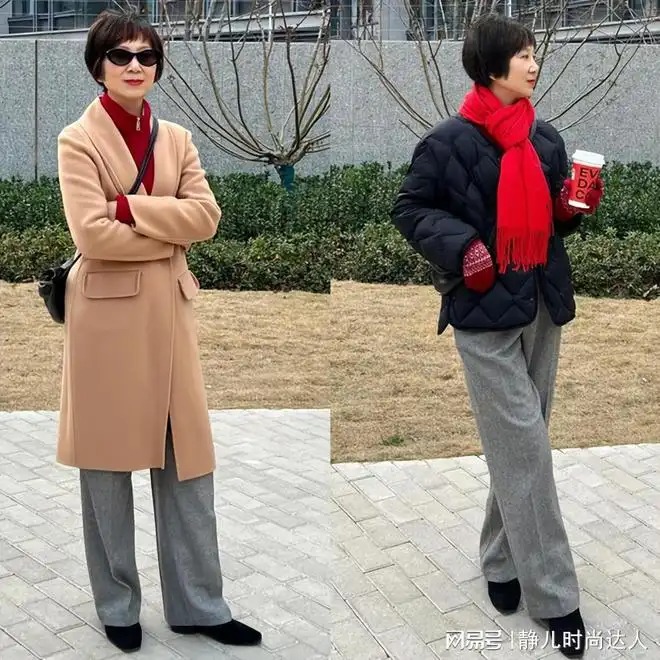 这位阿姨选择短款的毛呢外套配着高腰的下装,尝试了上面短下面长的搭配技巧,也能有效地拉长比例。