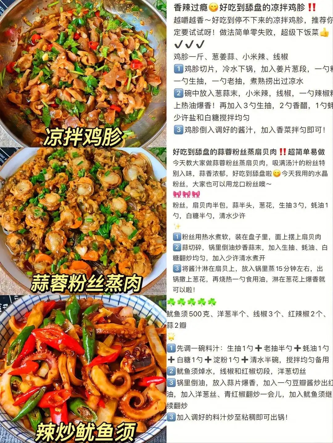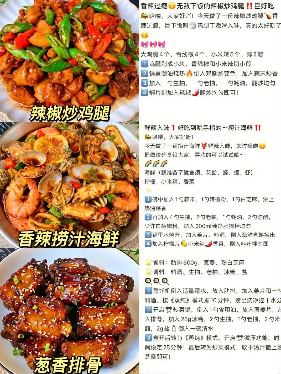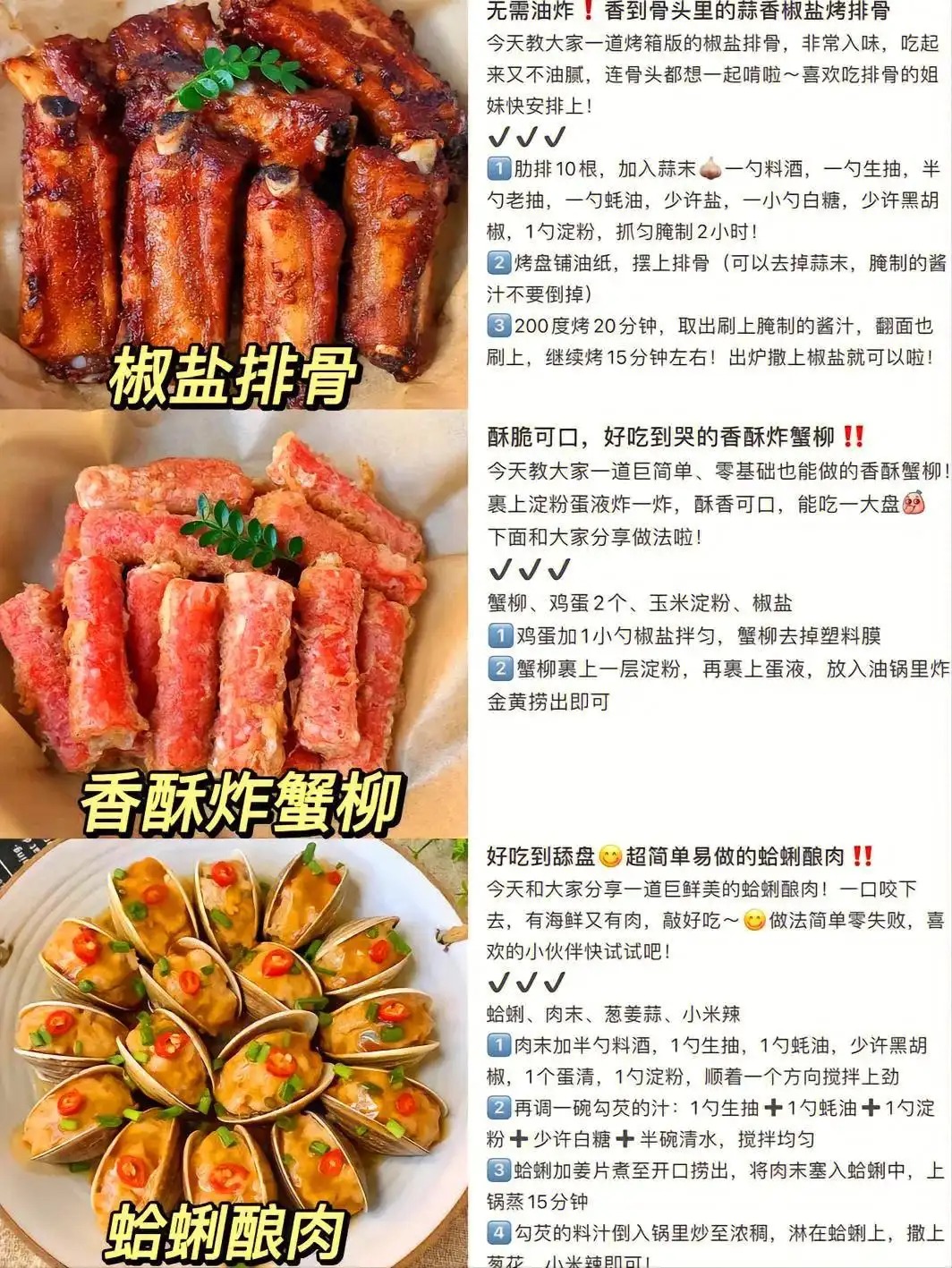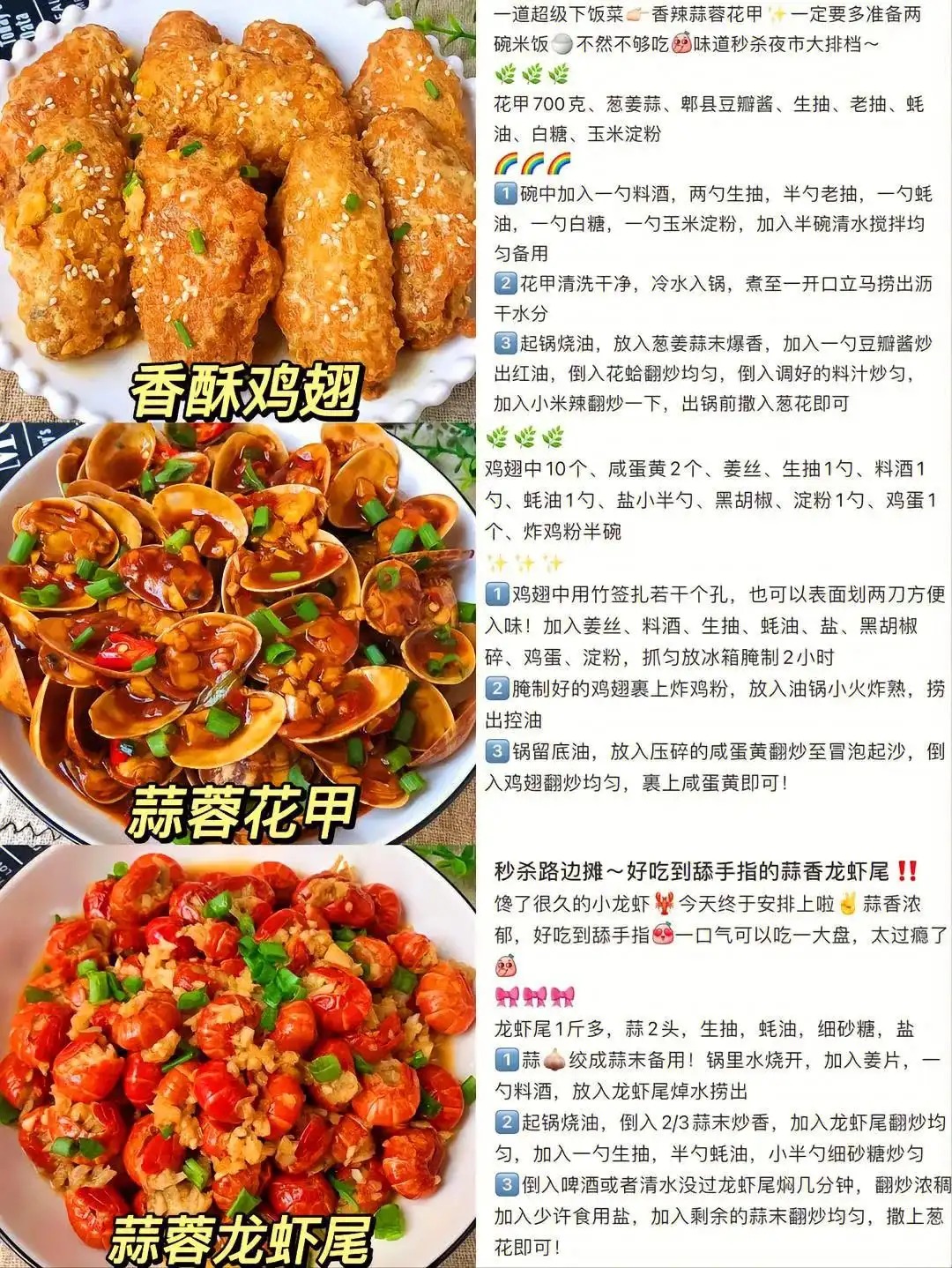 椒盐排骨、香酥炸蟹柳、蛤蜊酿肉、辣椒炒鸡腿、香辣捞汁海鲜、葱香排骨、香酥鸡翅、蒜蓉花甲、蒜蓉龙虾尾、水煮肉片、香辣鱿鱼须、蒜香柠檬鸡翅、油焖大虾、香酥虾仁、芝士脆皮鸡、凉拌鸡胗、蒜蓉粉丝蒸肉、辣炒鱿鱼须、黑蒜牛肉粒、香辣孜然牛肉、香煎梭子蟹、牛肉虾仁滑蛋、辣炒年糕牛排、南瓜蒸排骨