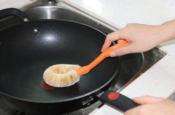 做完饭后,锅里粘了些又硬又干的食物残渣,很难洗掉,如果用钢丝清洁球擦的话,容易损伤锅底涂层。在锅里撒点小苏打,倒点热水浸泡一会儿,待食物残渣和油垢变松软后,轻轻一擦就能洗掉。