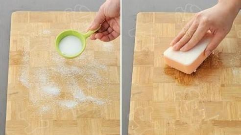 在砧板上洒上一层小苏打粉,再用刷子刷洗一下就可以,不但可去除砧板上的污渍,而且还能除臭。