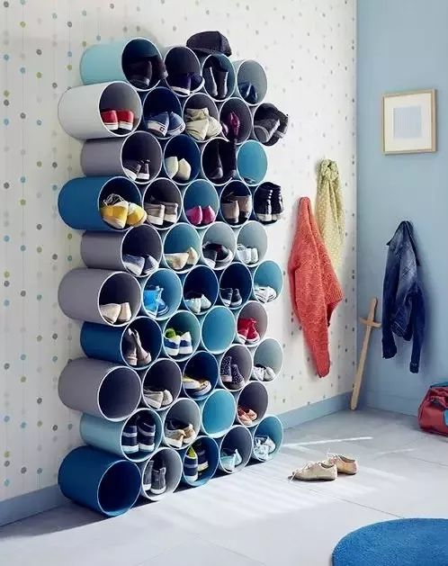 14、圆形桶装物品:装修遗留下来的水管或者不用的箱子、桶之类的物品梳理干净,按照一定的规律排列于墙上,用来收纳鞋子非常有创意。