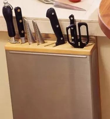 2、刀具等利器:统一整理在不锈钢的盒子里,固定在柜台的一侧。如果家里有小孩子,那盒子最好安在橱柜门的内侧。