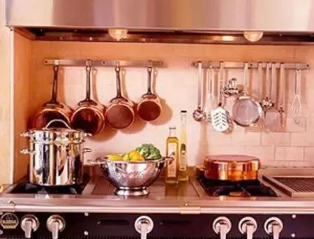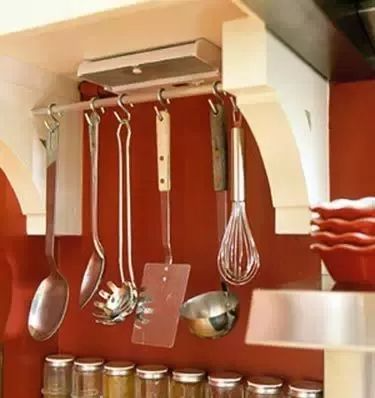 1、挂钩:能挂起来的厨房用具都可以挂上。挂杆用普通的毛巾杆就可以充当,省钱。