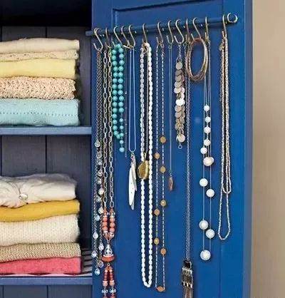 7、衣柜门内侧:可以买一些铁钩或者粘钩,悬挂丝巾、毛衣链等小物件。