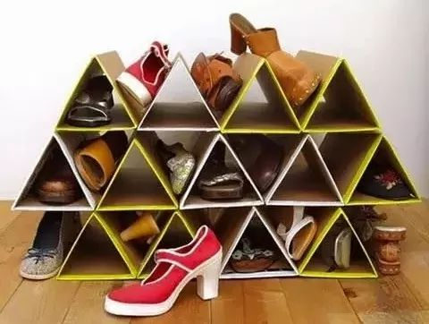 19、瓦楞纸、纸皮:弄成一个个三角形的形状,用黏合剂粘起来变成一个稳定的形状来收纳鞋子。