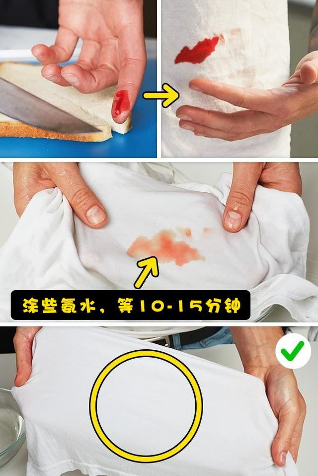 如果你想去除血迹,在上面涂些氨水,等10-15分钟。然后,如果污渍还在那里,用肥皂把衣服洗干净。
