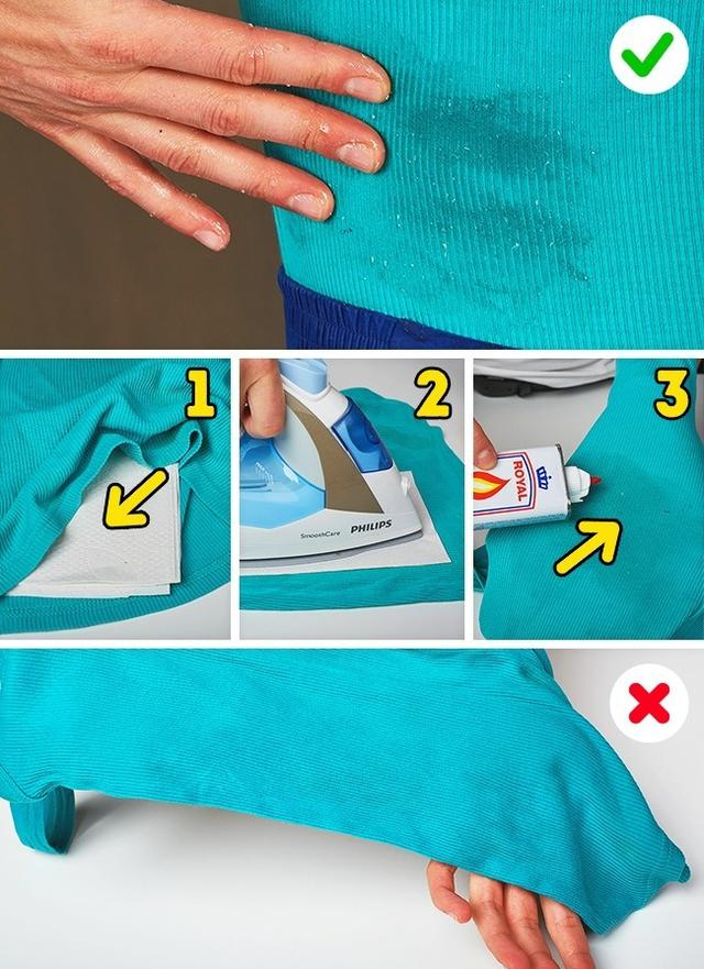 如果污渍是新鲜的,将其放在2-3层纸巾之间。熨烫这件衣服,如果污渍仍然存在,请重复上述操作。如果不能完全去除污渍,请使用汽油将其清除干净。