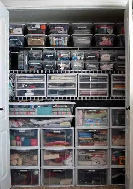 这是一个储藏叠放式衣物布料和杂物的大柜子,全部使用一目了然的塑料收纳抽屉和收纳盒,贴上标签。
