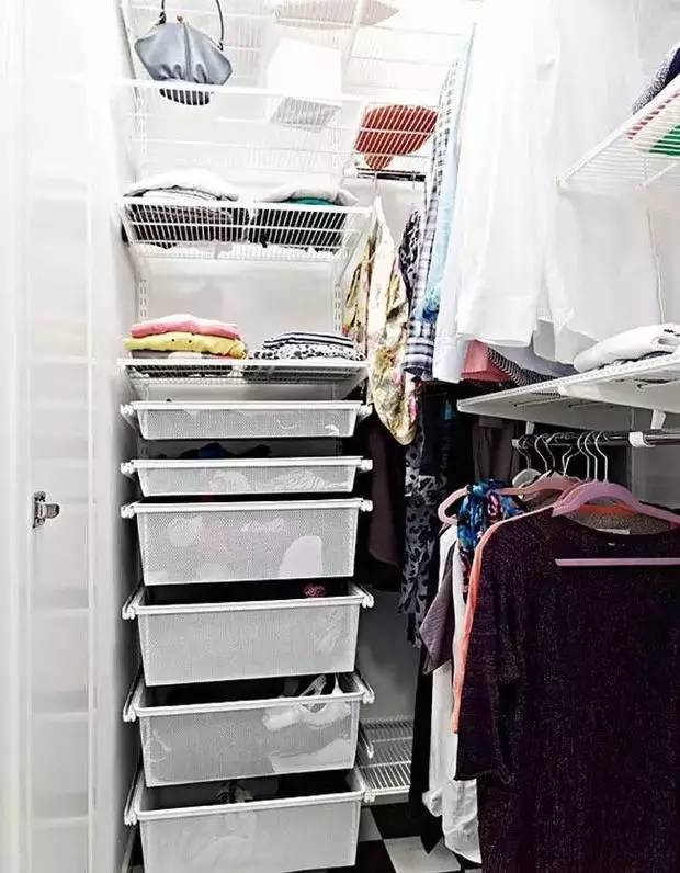 从上到下,搁架、浅抽屉、深抽屉,虽然装满了衣服,但是全部选择网篮风格,整个空间也不至于太沉重。