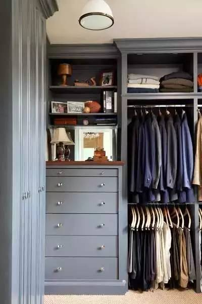 衣帽间里,定制一个实用的斗柜,收纳叠放的衣服和小件物品。用不同高度的挂衣杆分别挂西装和西裤。