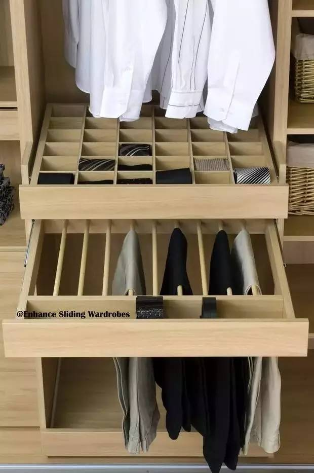 自带小格的抽屉特别适合收纳领带、袜子等小物,专用的裤挂更好的保护你的裤子减少褶皱