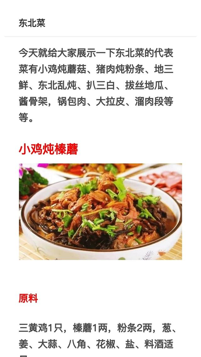下面是小鸡炖蘑菇、猪肉炖粉条、地三鲜、东北乱炖、拔丝地瓜、酱骨架、锅
