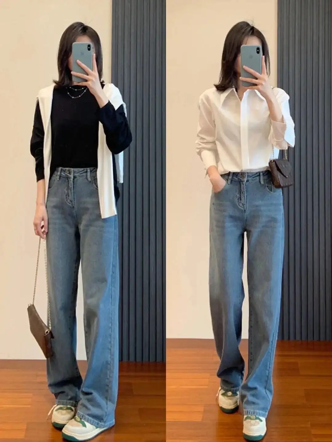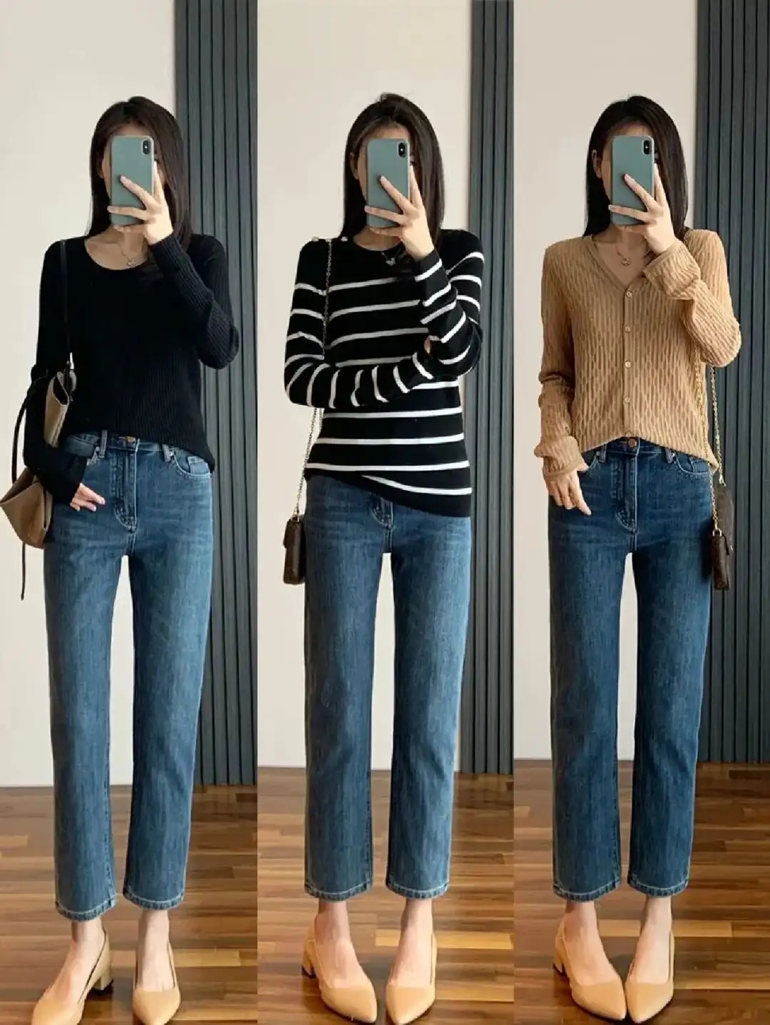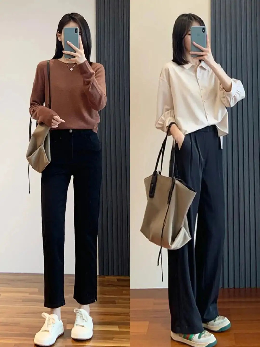 比如,博主身上这类修身线衣和修身衬衫,再比如她身上类修身窄版拖地牛仔裤,目之所及,全是适合日常外穿的基础款,单品上身精致得体,适合绝大多数氛围需求,去哪都不出错。