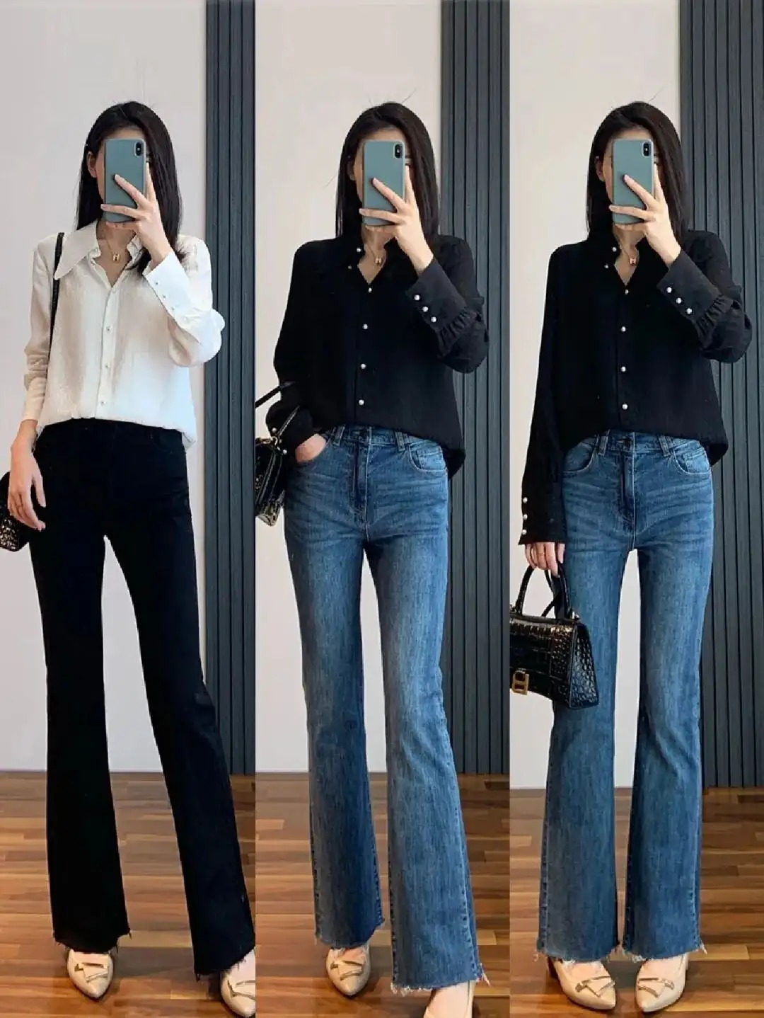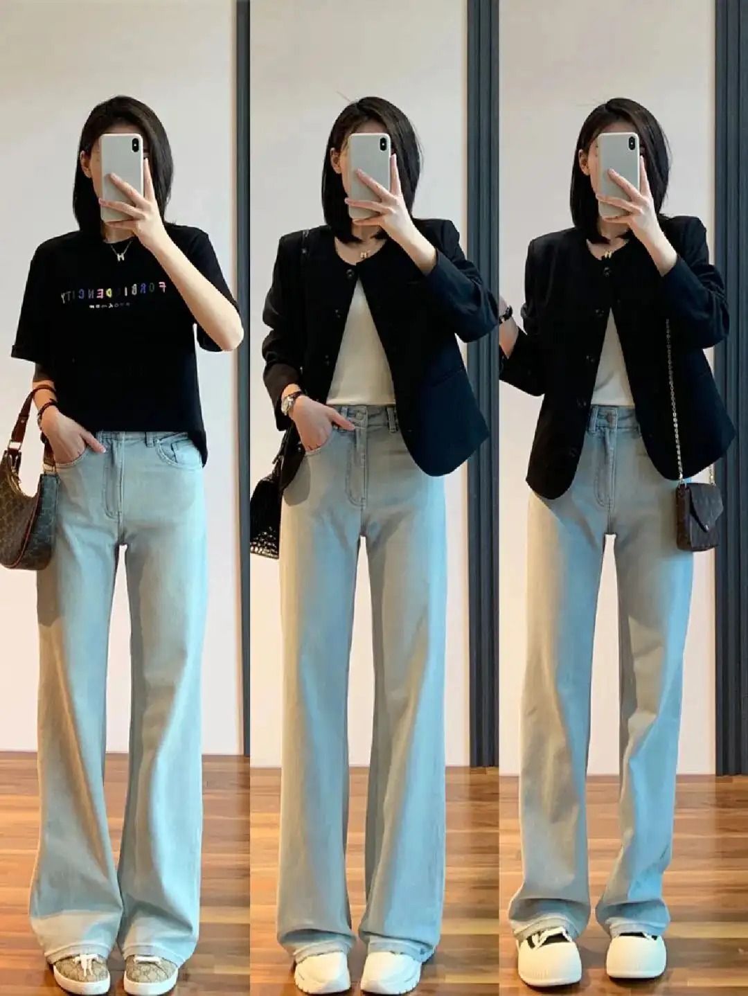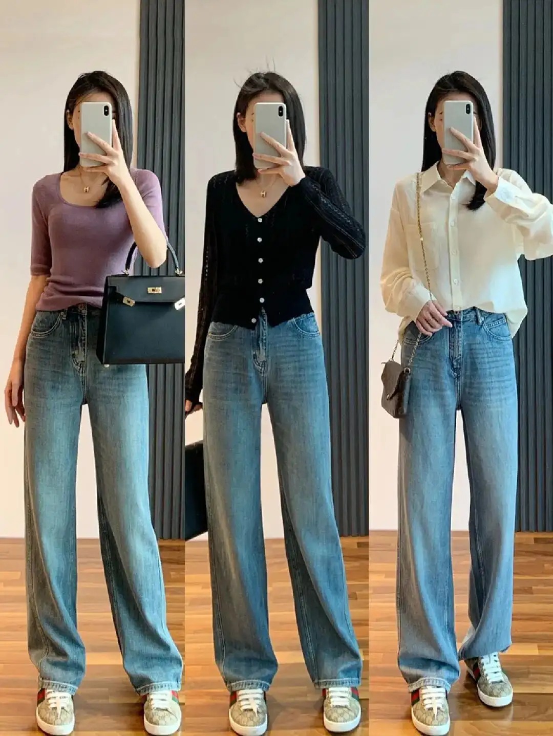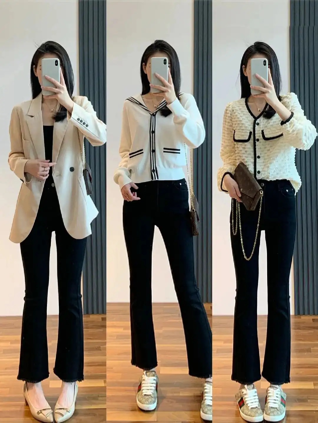比如,博主身上这类修身线衣和修身衬衫,再比如她身上类修身窄版拖地牛仔裤,目之所及,全是适合日常外穿的基础款,单品上身精致得体,适合绝大多数氛围需求,去哪都不出错。