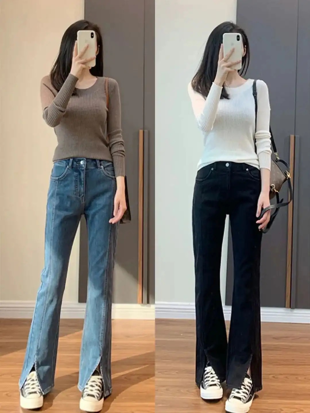 大方得体又整洁的日常私服,是绝大多数女士的穿衣需求,博主身上这类紧身打底衫搭配高腰修身开叉直筒裤的造型就值得借鉴。