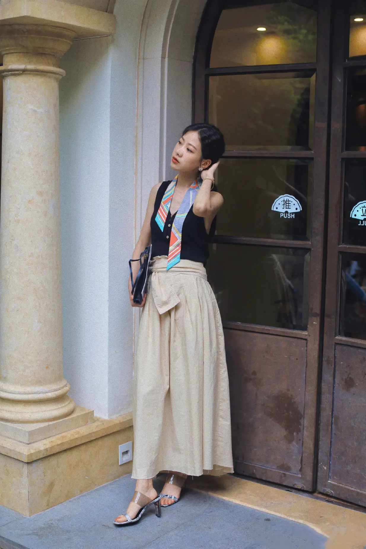 如果比较喜欢搭配裙装,也可以通过丝巾的风格,让搭配变得很有魅力,比如黑色的马甲,搭配卡其色的高腰半身裙,结合拼色丝巾,能够让风格变得更有亮点,配色也不会看起来过分单调。