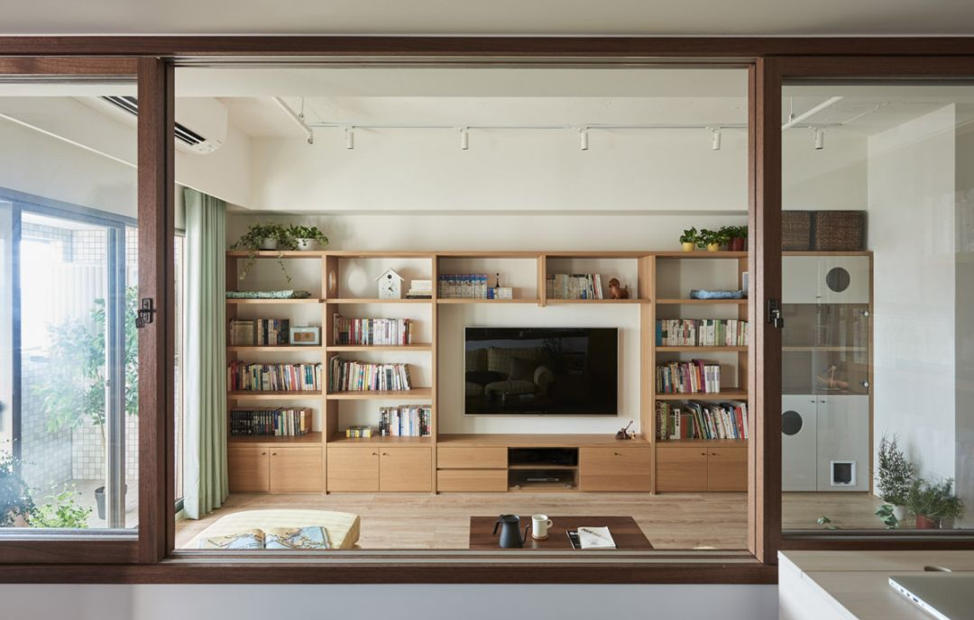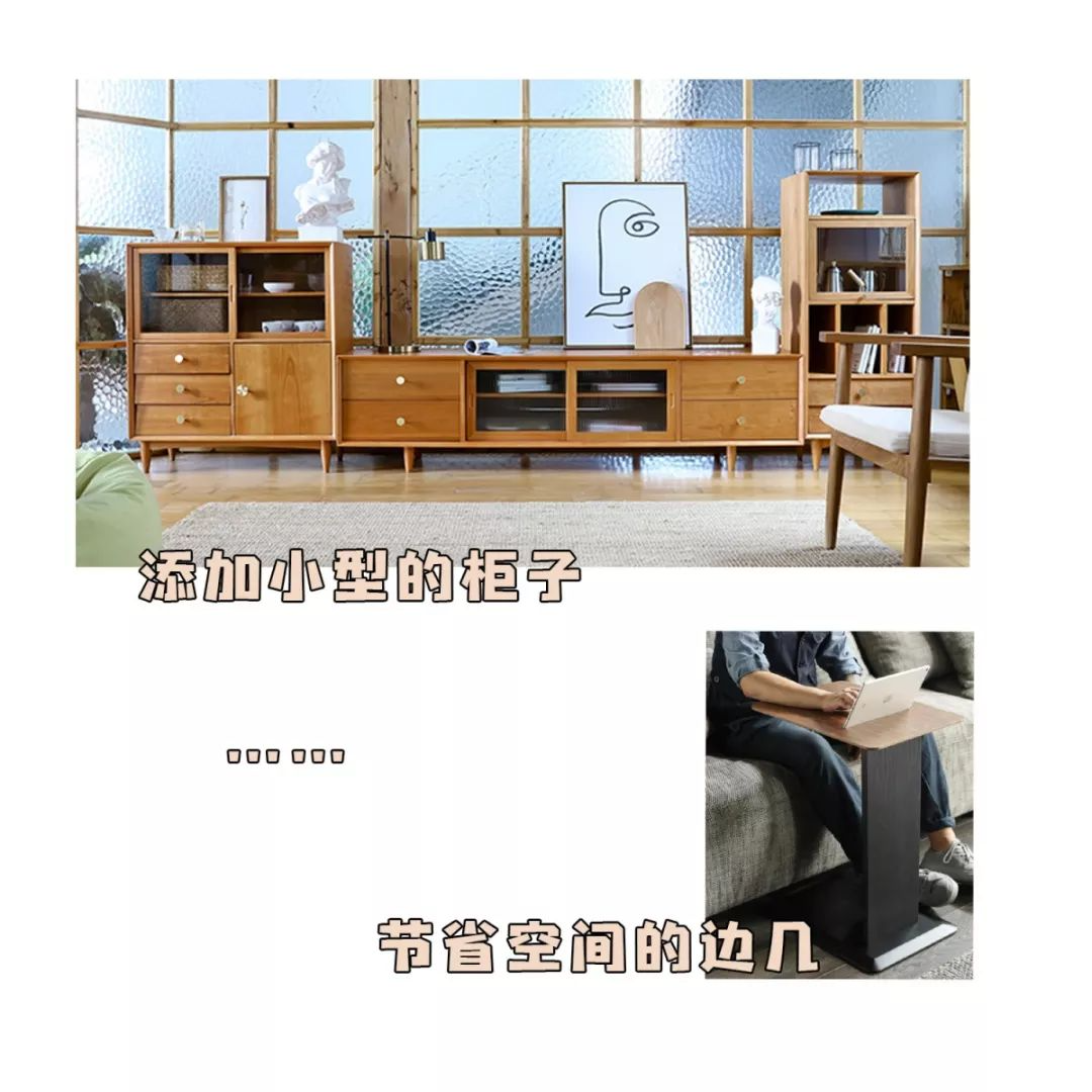 沙发没有直接靠墙,而是留出空间做收纳柜; 沙发和茶几选择小尺寸,不会过多挤压原本不大的客厅空间; 无论是沙发背后的书柜,还是电视柜都没有顶天立地,在视觉上减少压迫感。