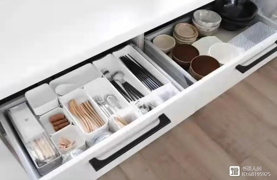 常用的厨具悬挂起来,方便拿取; 常用的餐具放在方便拿取的柜子里; 调料放在置物架上,做饭的时候才不会手忙脚乱; 洗碗池和橱柜台面上不要堆放物品; 平底锅放在文件夹收纳盒里,竖式收纳; 水槽下面置放收纳筐,可以收纳许多物品。