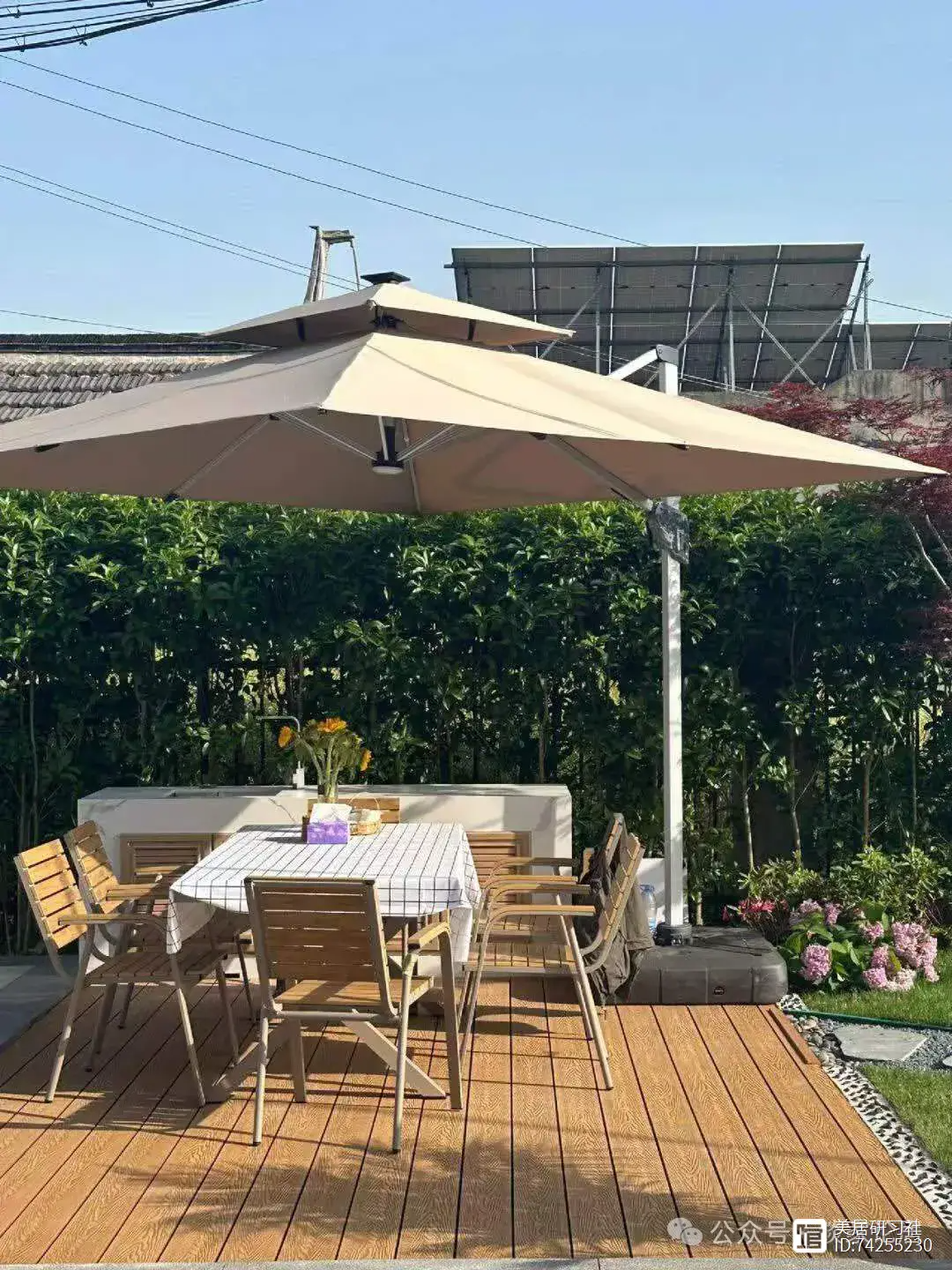 院子的另一侧,是一个户外木地板的平台,摆放着一套精致的户外桌椅和一把大大的太阳伞。在这里,主人可以邀请亲朋好友一起聚会、烧烤,享受户外生活的乐趣。