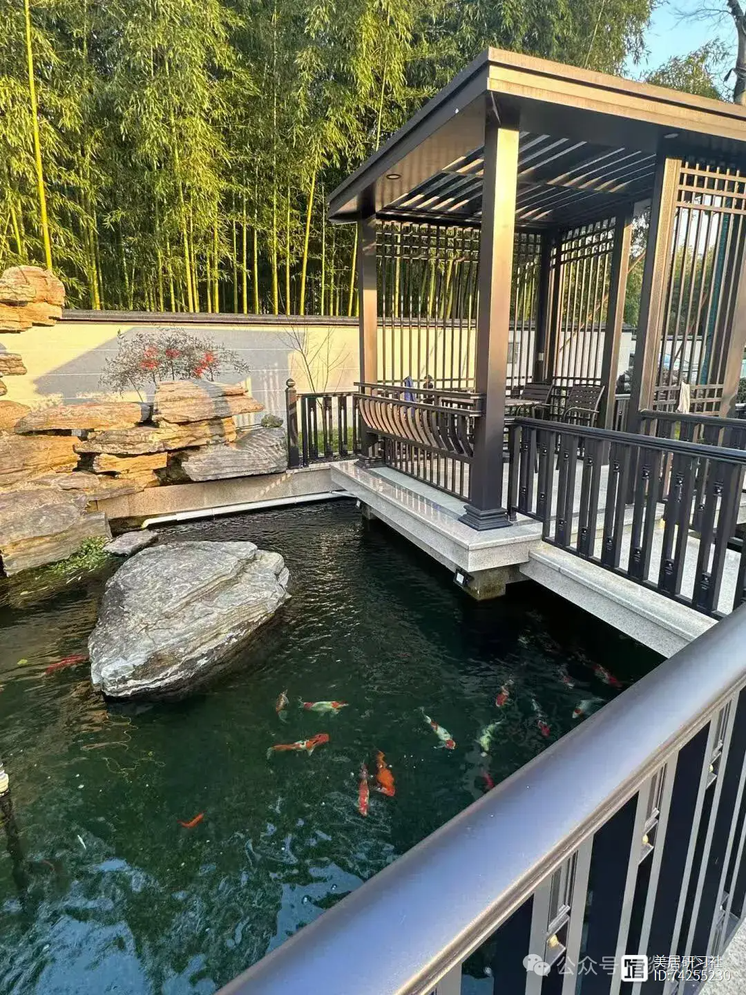 假山鱼池错落有致,凉亭选用的是铝合金材质,新中式风格的设计简洁而雅致,既为院子增添了一处休憩的好去处,又成为了院子中的亮点。