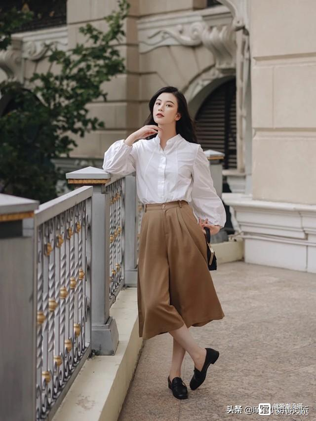 技巧五、纯色衬衫加上阔腿裤,宛如清纯邻家小妹