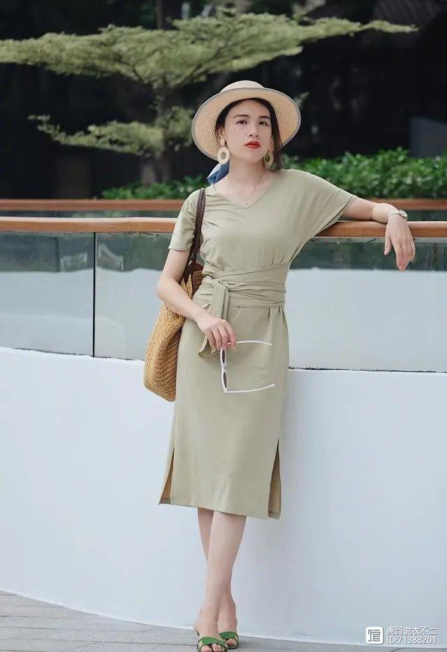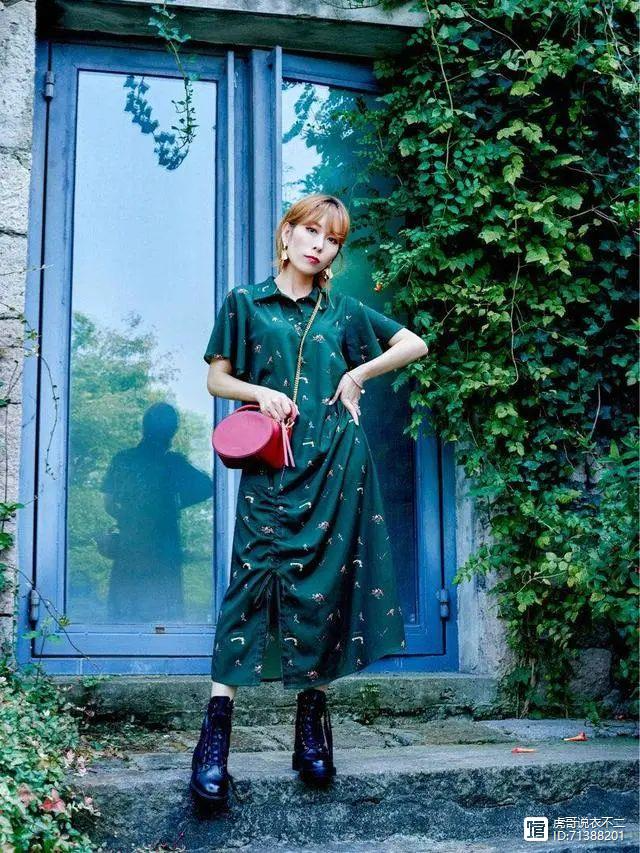 而同色或者是颜色相近的一身造型在视觉上延伸感会更加强烈一些,也会将你的身材拉得更长一些。就像这条墨绿色的裙子,虽然比较宽松,但是因为整条裙子色系非常统一,所以显高效果还是非常明显的。