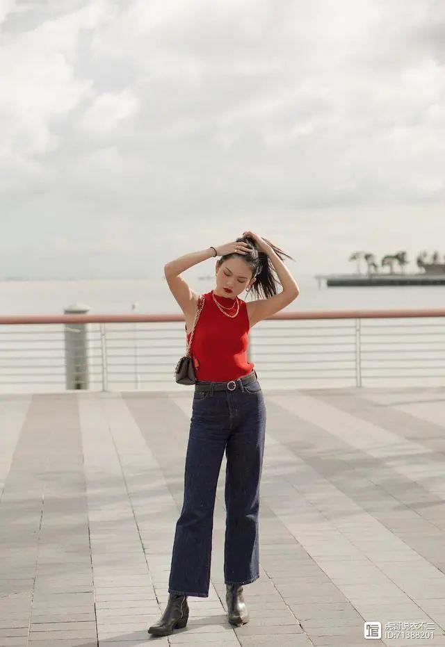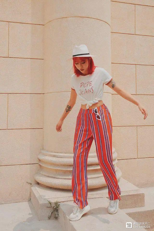 所以我们在穿T恤的时候可以稍微的加入一点小心思,如果你搭配的是高腰裤的话可以直接将衣摆塞进裤腰里面,这样很容易就可以提高腰线。