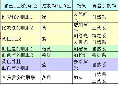 用什么颜色才更适合自己的肌肤呢?亲们可以参考一下下表,对照自己的肤色选择适合的控制粉底。