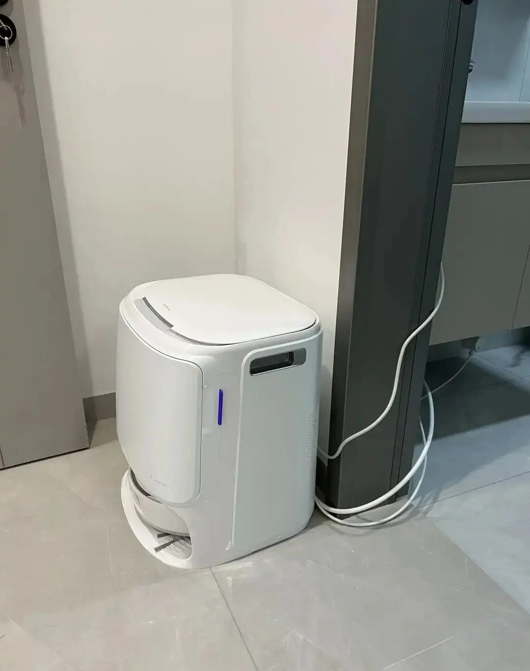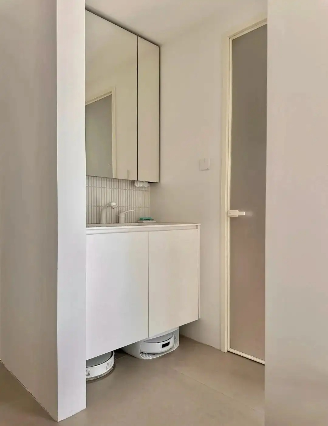 这位网友家,自动上下水的扫地机器人,卫生间收纳不了,只能放在卫生间门口,绊脚绊手的,显得特别突兀。