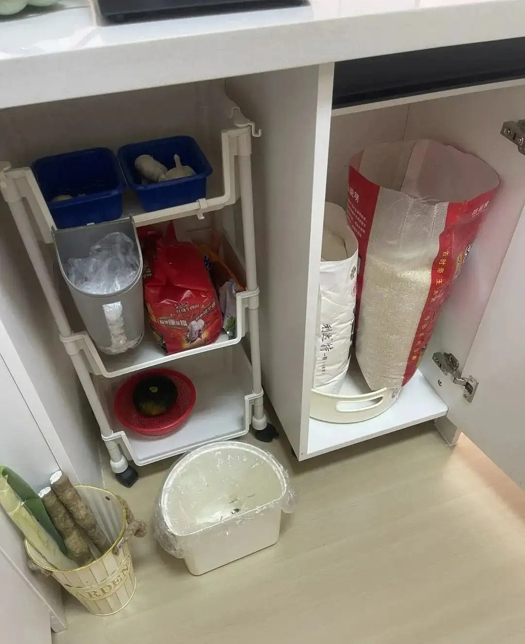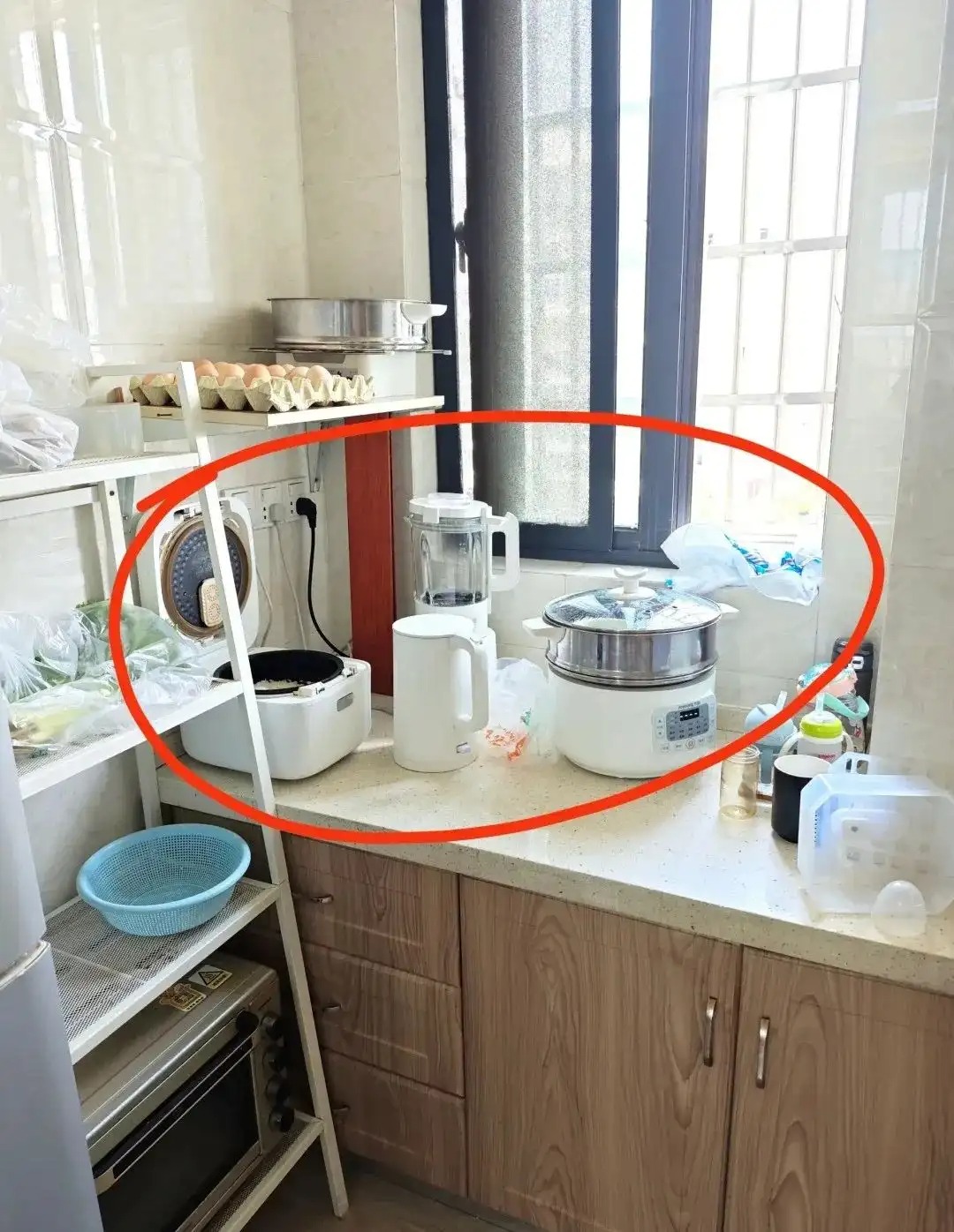 这位网友家,小家电摆放在橱柜台面的一角,又多又乱,不仅浪费空间,还影响空间颜值。