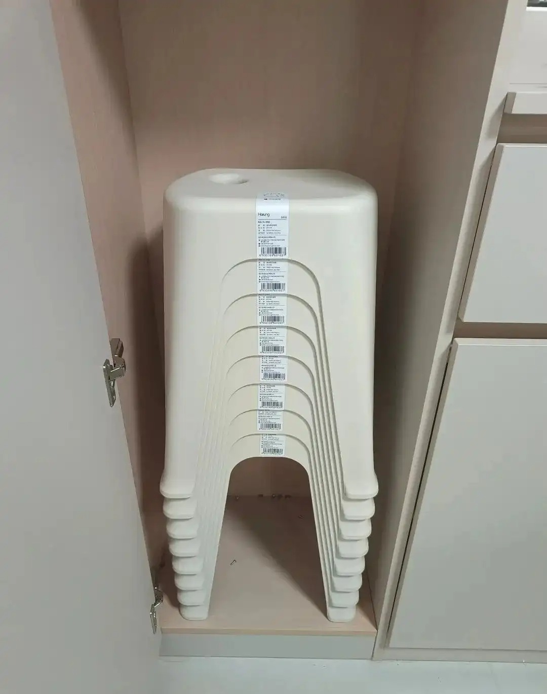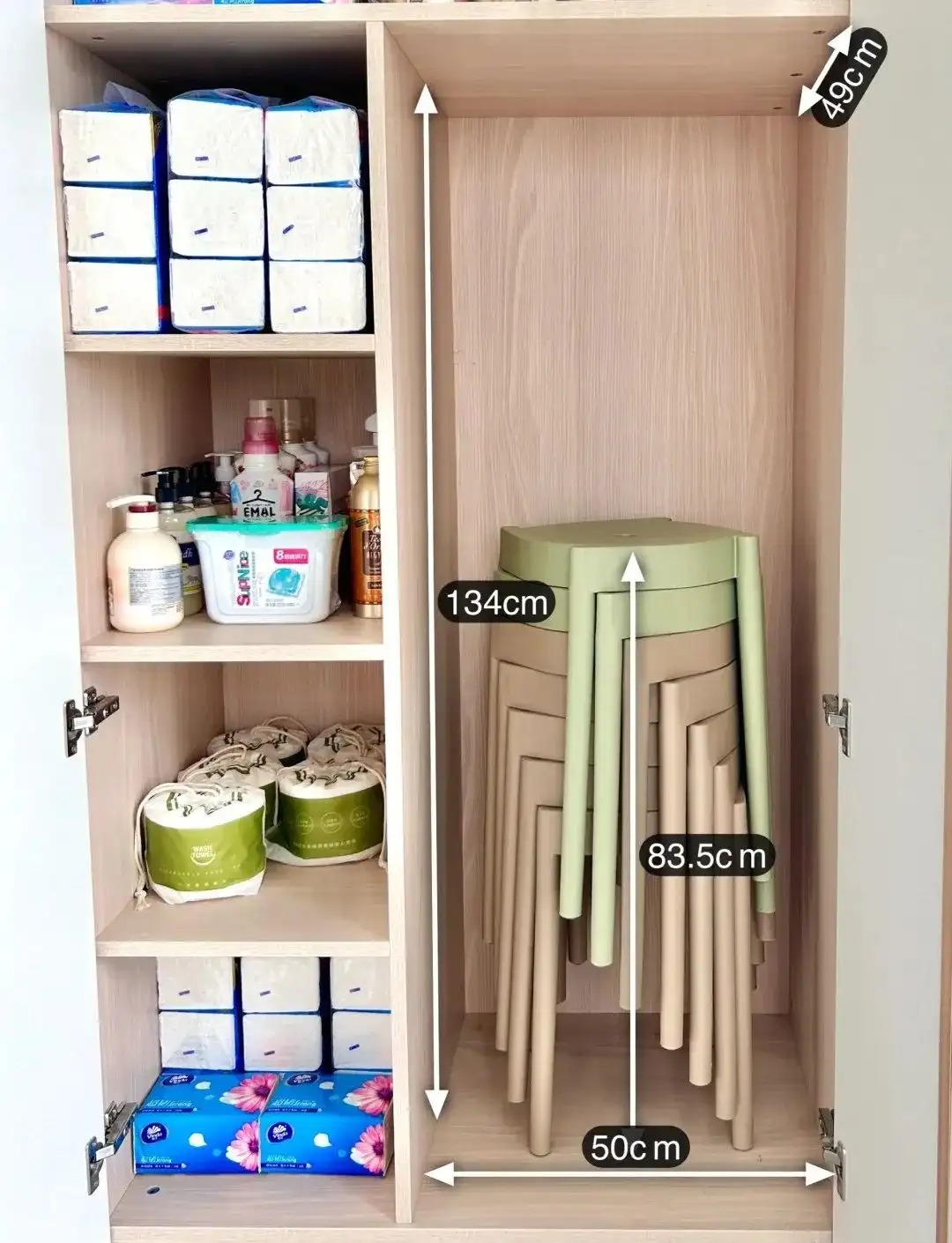 备用凳应该怎么收纳呢?在离餐厅较近的柜子,如餐边柜或鞋柜,深度超过40厘米,预留一个宽度50厘米、高度适宜的格子空间,进行凳子收纳。