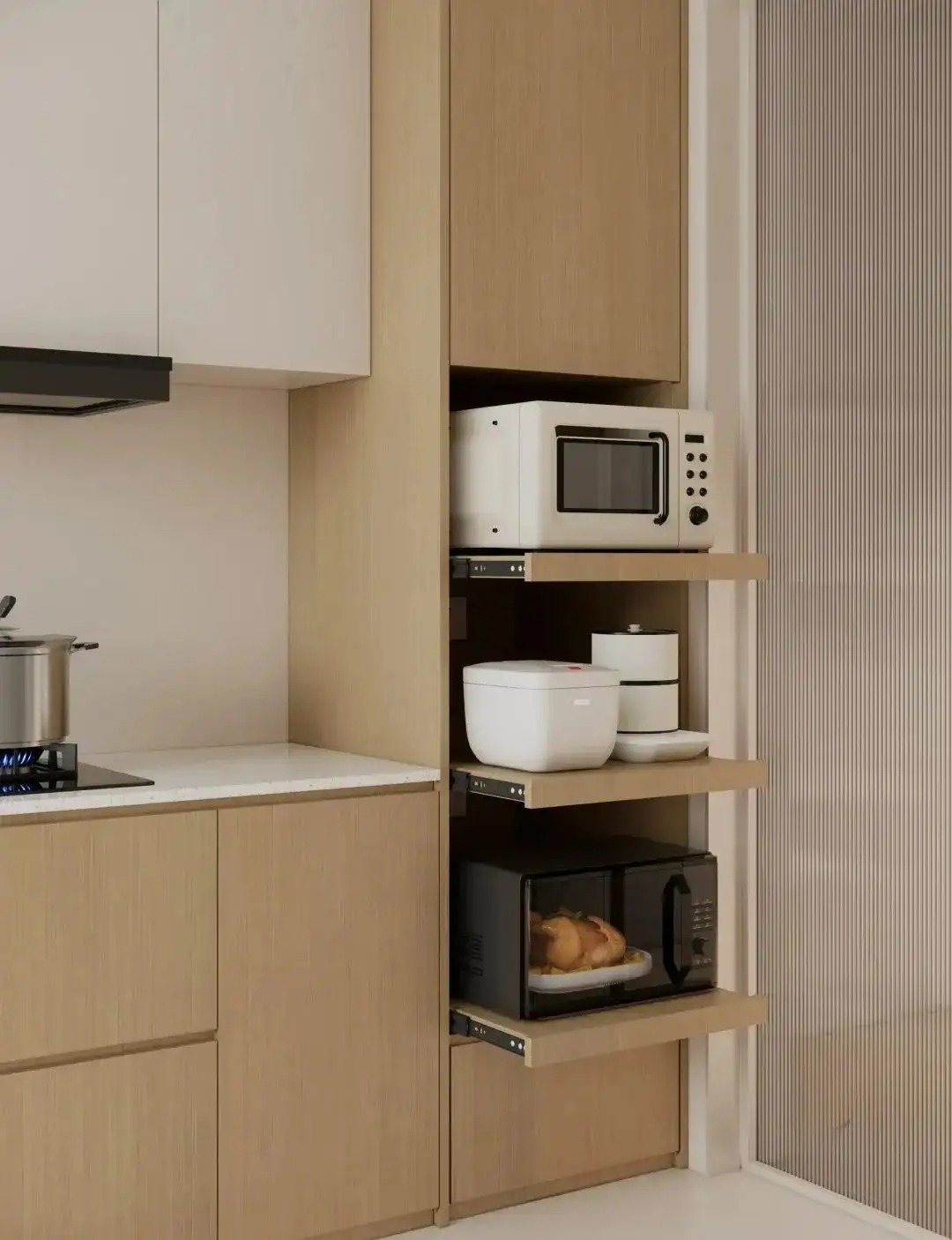 若装修预算不错,可以安装抽拉板,把小家电收纳到抽拉板上,使用时抽拉出来即可,体验更好、舒适性更好。