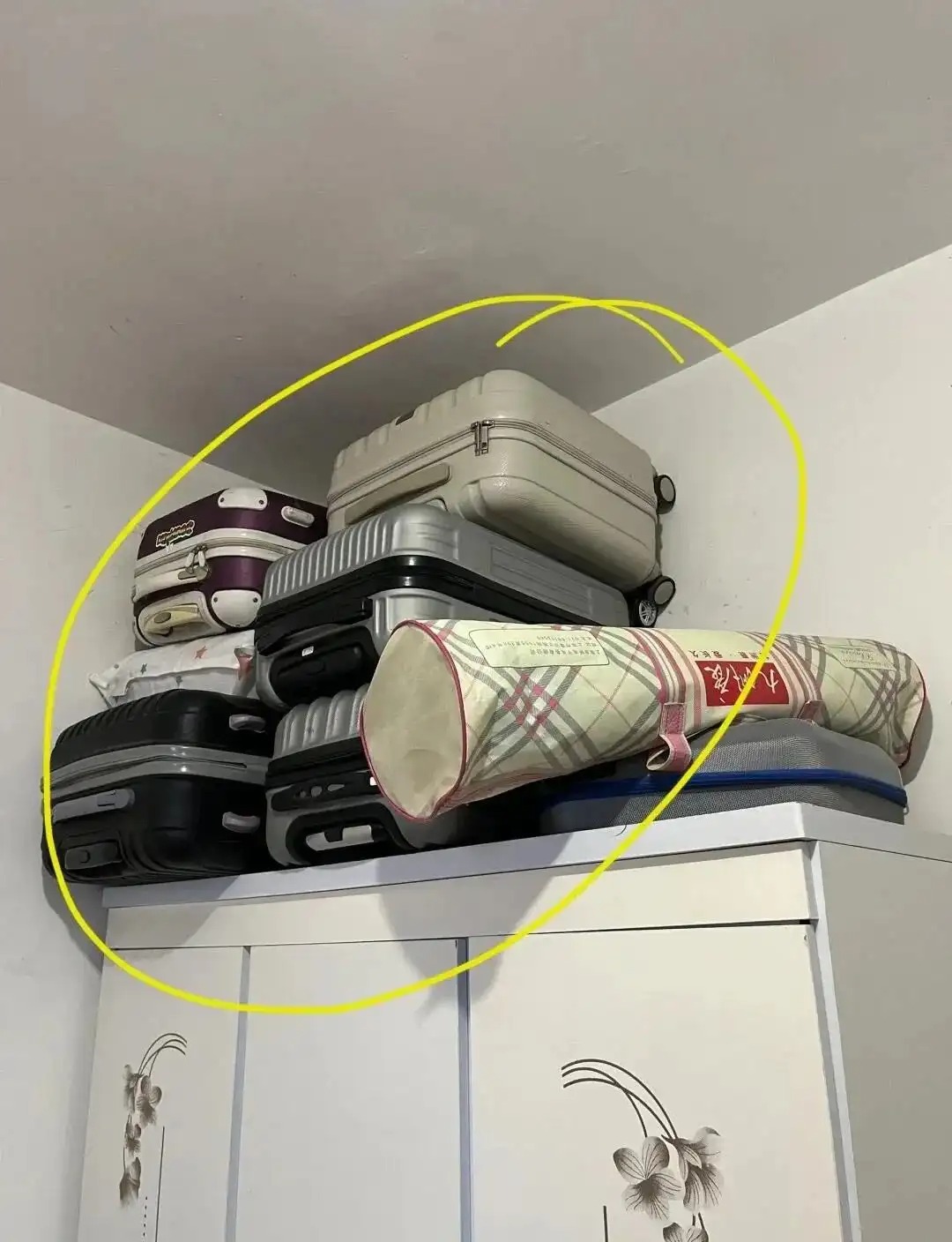 也有网友家,把行李箱放在柜子的最上面,不仅有掉落砸到人的风险,而且取和放根本不方便,特别吃力,平时依旧是乱糟糟的。