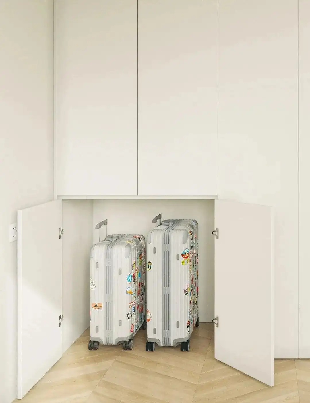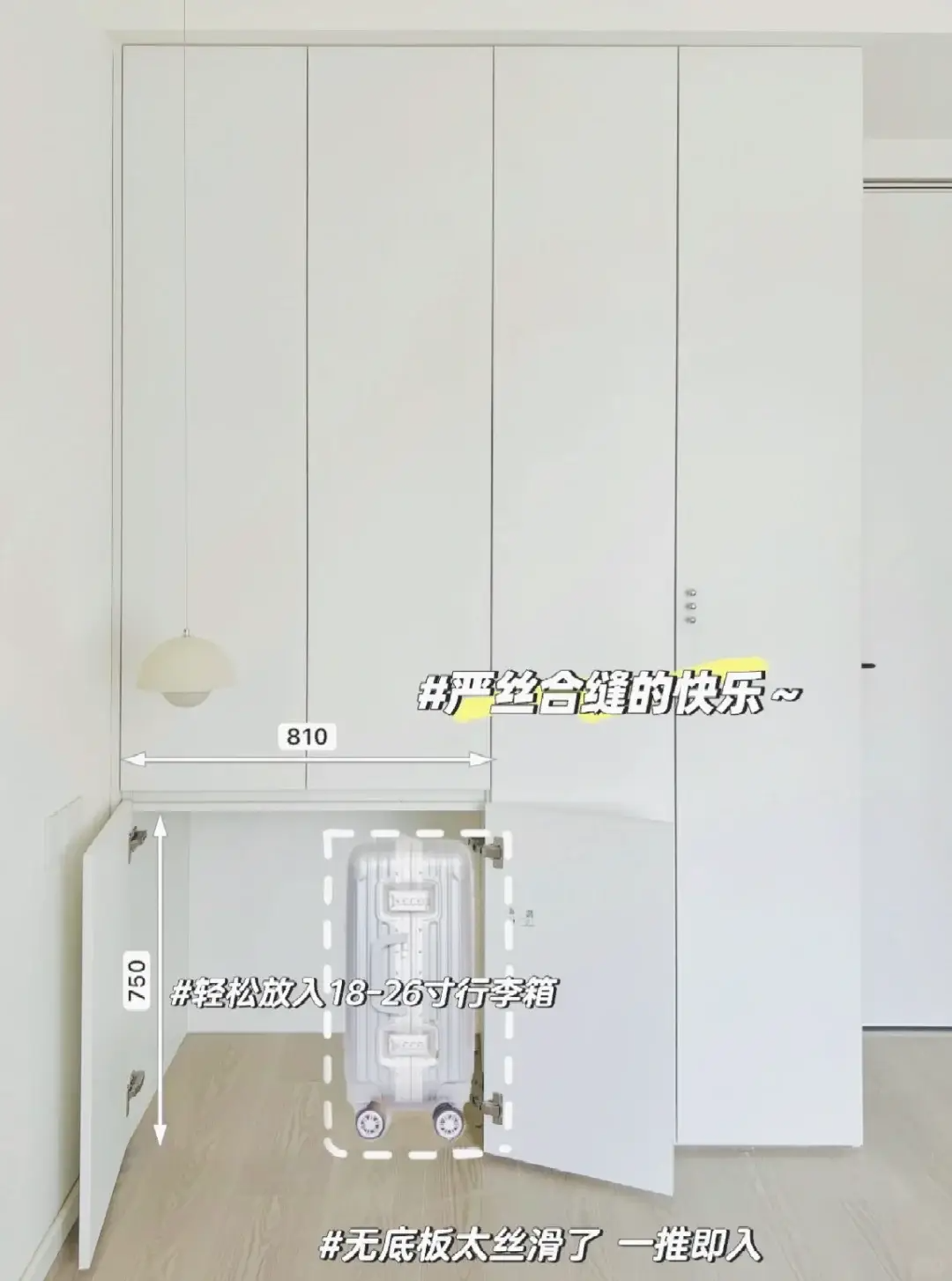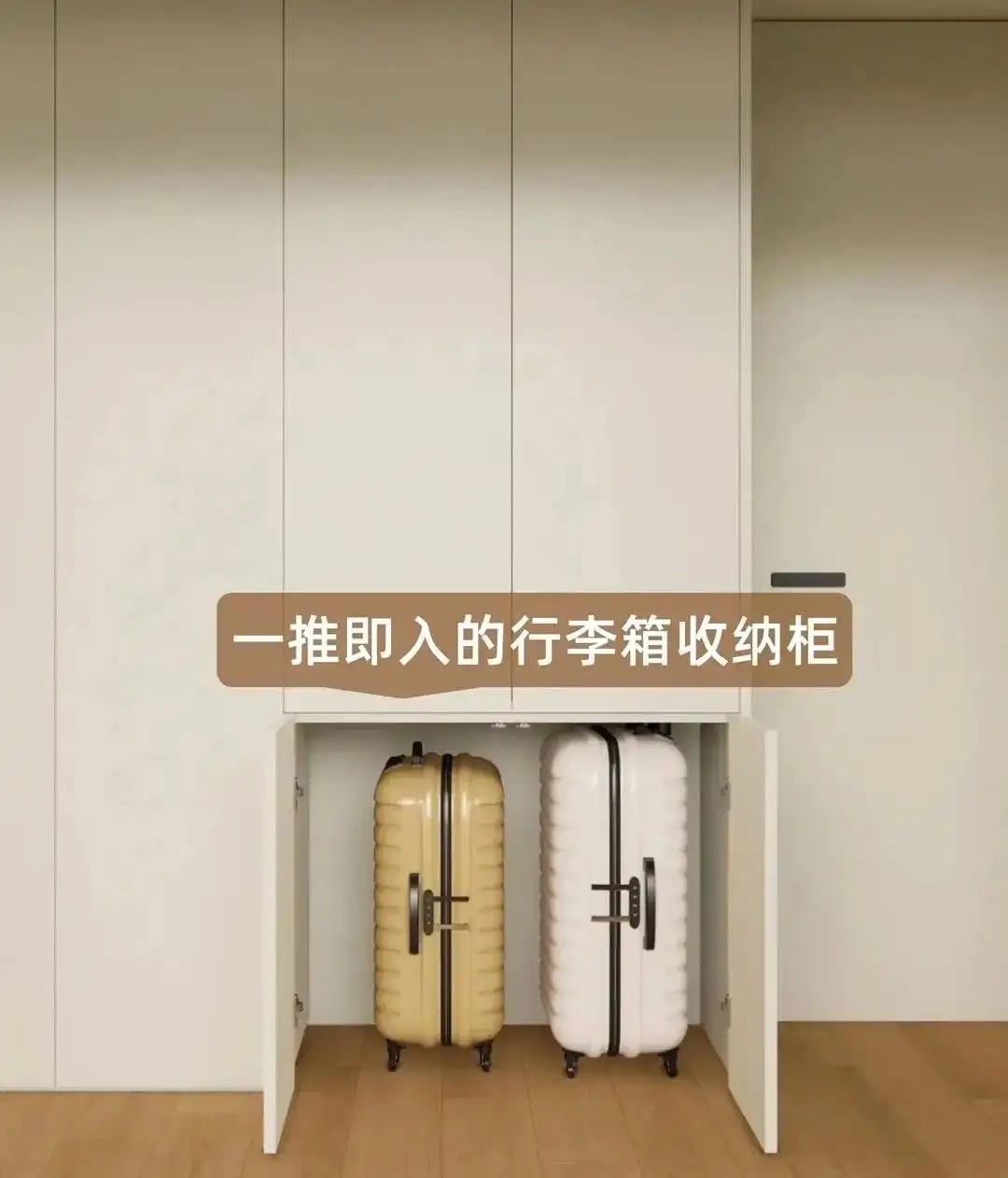 其实,定制柜子时,一定要给行李箱安个家,避免上面这样的尴尬情况。做法很简单,设计无底柜即可。
