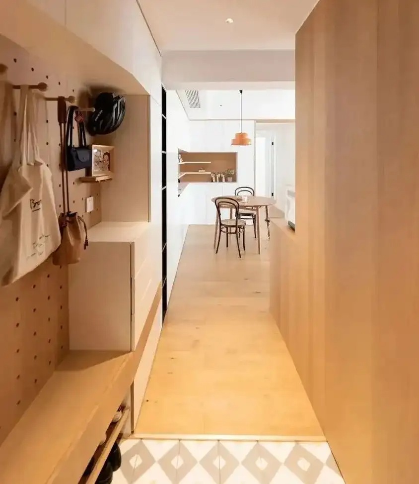 若玄关空间不大,可以直接在玄关墙面上安装洞洞板或挂钩,对衣物和包包进行收纳。