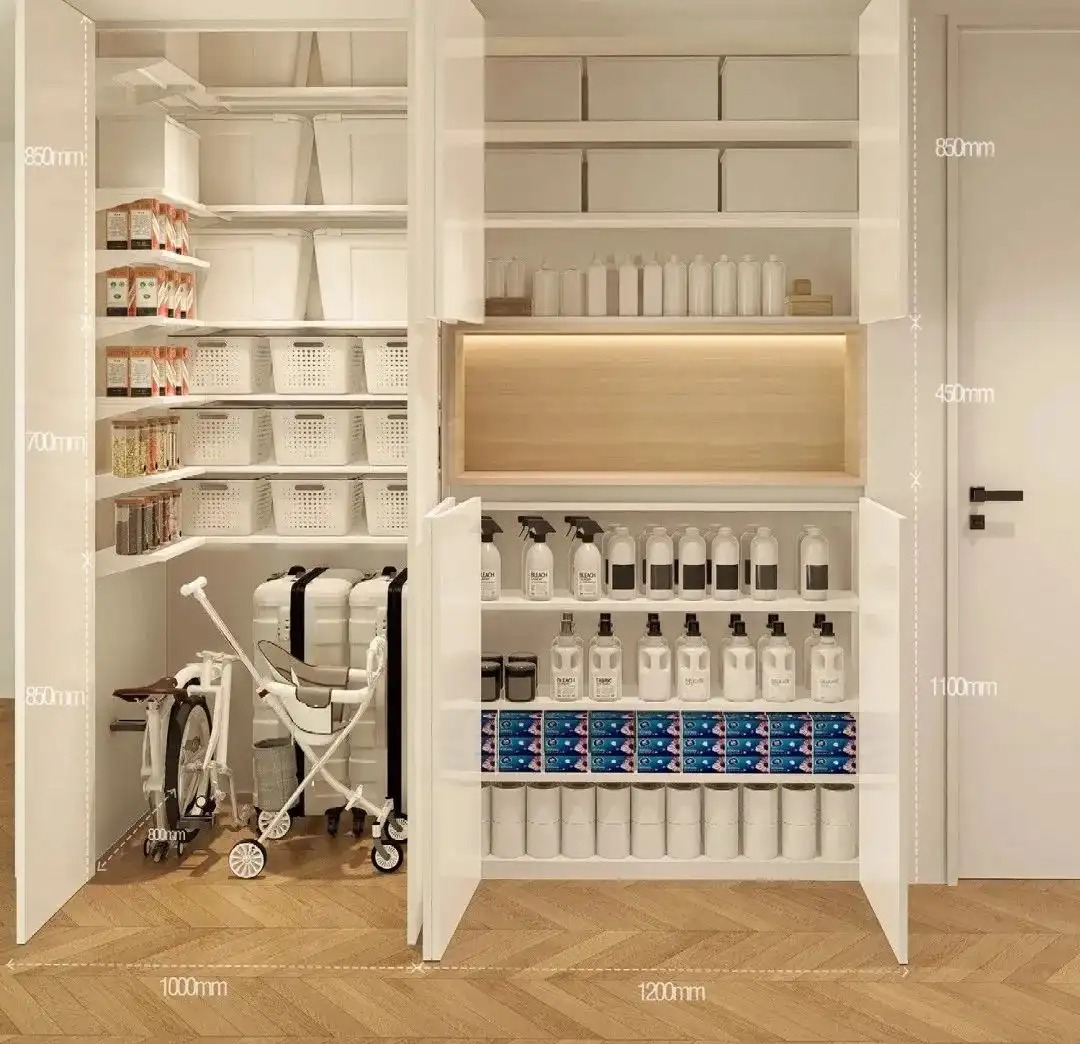 很多婴儿车都可以折叠,建议借鉴行李箱收纳的思路,设计无底柜进行收纳。设计为800库,和行李箱一样把婴儿车、婴儿用品全放进这里,今后还可以放他们的折叠自行车。