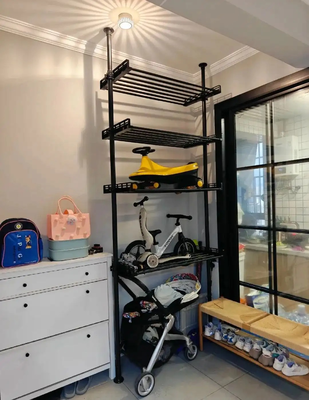对于已经入住的屋主,若装修时没有考虑婴儿玩具车的收纳,可以网购图中这种顶天立地的收纳支架,对孩子的各位玩具进行收纳。