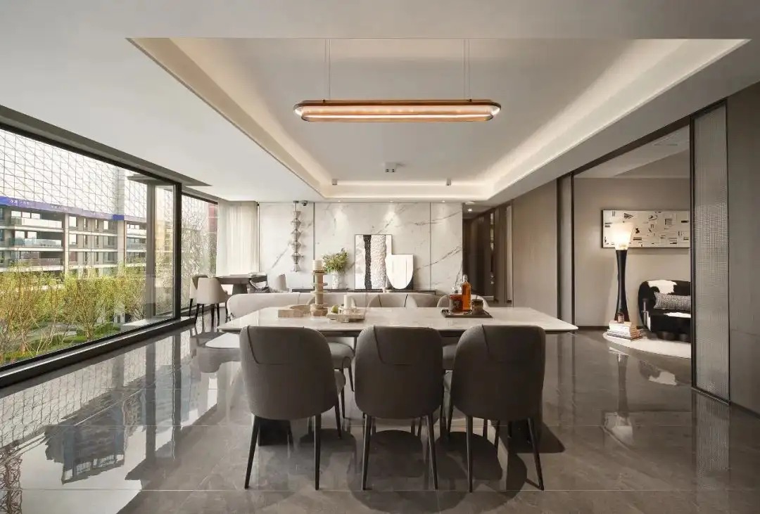 客厅采用约 7 米大开间的横厅设计,尺度非凡。如此宽敞的空间,可轻松容纳家庭聚会、朋友派对等各种社交活动。与客厅无缝衔接的餐厅,面积阔绰,摆放一张大尺寸餐桌后仍有充足的活动空间,让用餐时光更加从容惬意。这种客餐厅一体化的设计,打造出一个超大型的公共活动区域,使整个空间通透大气,视觉上更为开阔,一家人的互动交流也更加便捷。