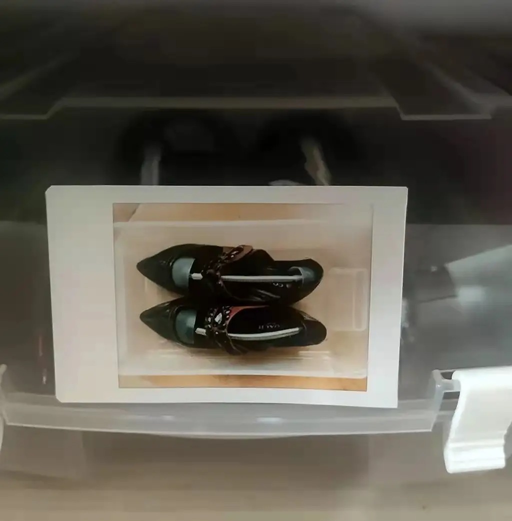 内置物品用手机拍照后打印出来,贴在鞋盒收纳的外侧,取用就会特别方便。