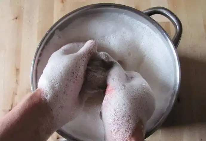 在泡过一段时间后水温不太高时(如果是第二天则需稍稍加温),用手尽量将无患子果皮里的皂苷挤出,你会发现有许多泡沫,直到尽可能将果皮攥干为止,这时就可将果皮扔掉了。