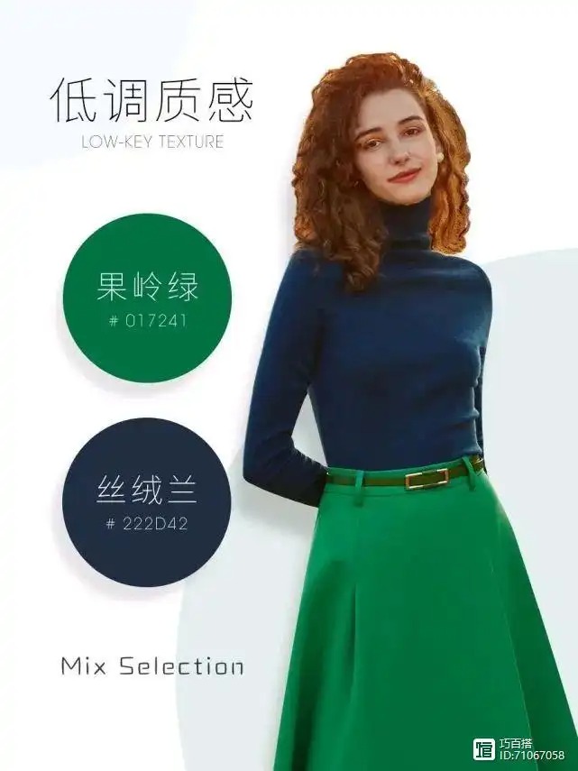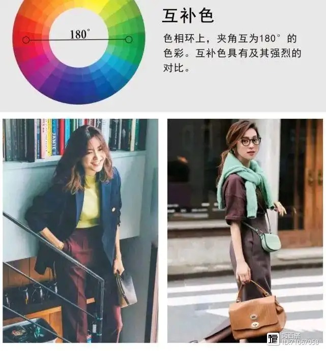 在色环上处于对立面的两种彩色,纯度建议选择一高一低的穿法,可以避免造型媚俗。