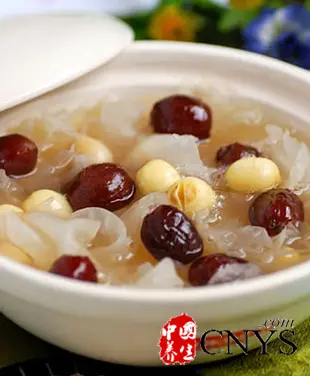 做法:水发10g银耳摘去蒂头,拣去杂质,漂洗洁净,加水适量,急火煮沸改用文火煮熟,至银耳酥烂,加入冰糖,搅拌至溶化。鸡蛋取蛋清加少许水搅匀后入锅中,再以文火令沸,出锅前加入熟猪油少许即成。早晨或睡前服食