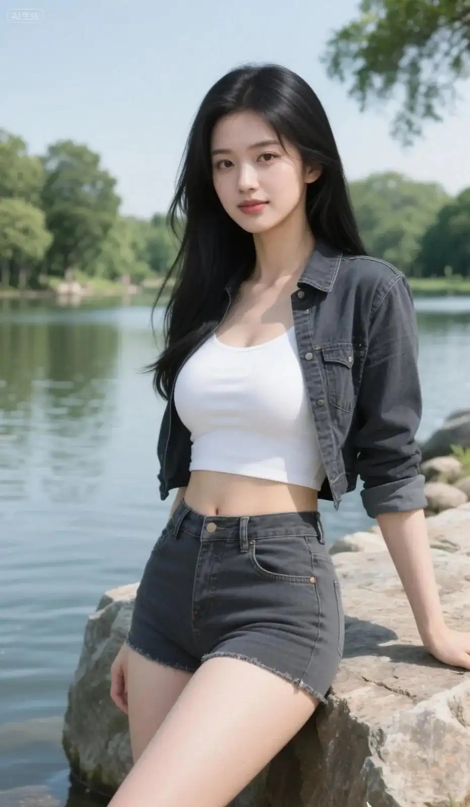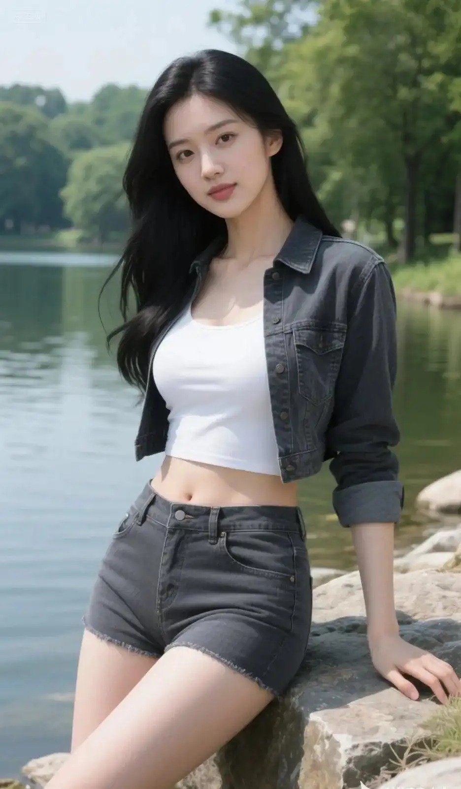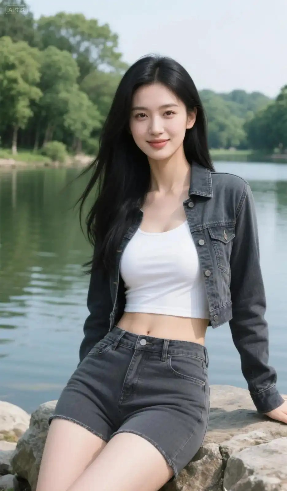 紧身背心+同色系牛仔外套+紧身裤,时尚青春的一道身影
