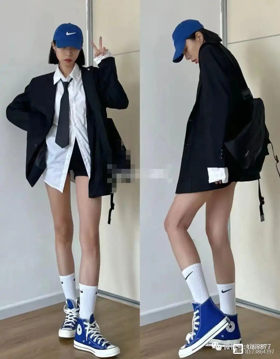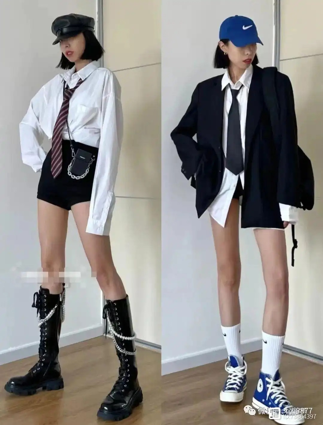衣橱必备白衬衣,简单的白衬衣也可以穿出“花”,打工人也要时髦通勤。用帆布鞋和棒球帽+领带,把通勤风西装衬衣搭配出简单休闲风;衬衣一扎,漏出腰身,高腰短裤搭配中筒靴,显腿长绝了!
