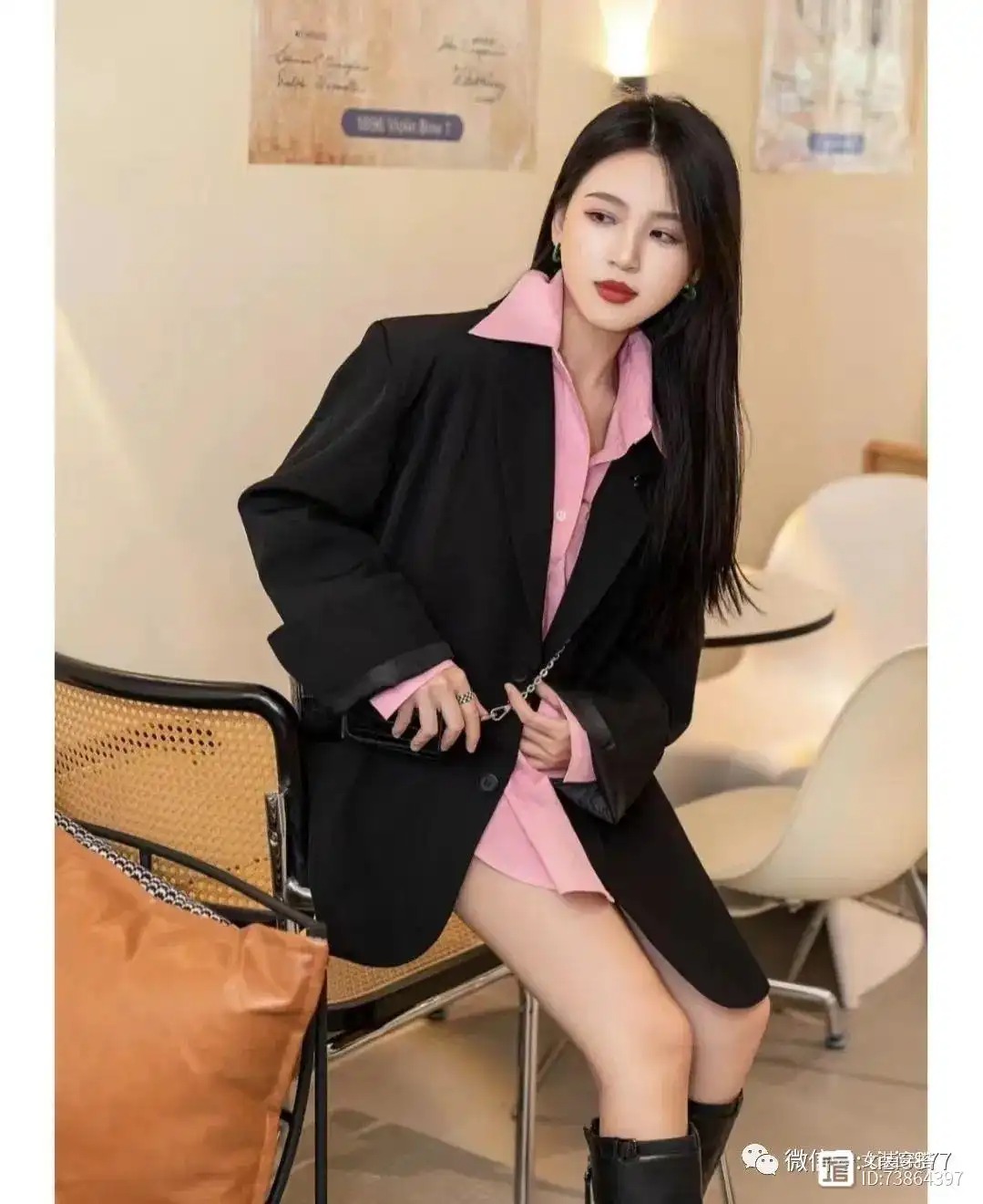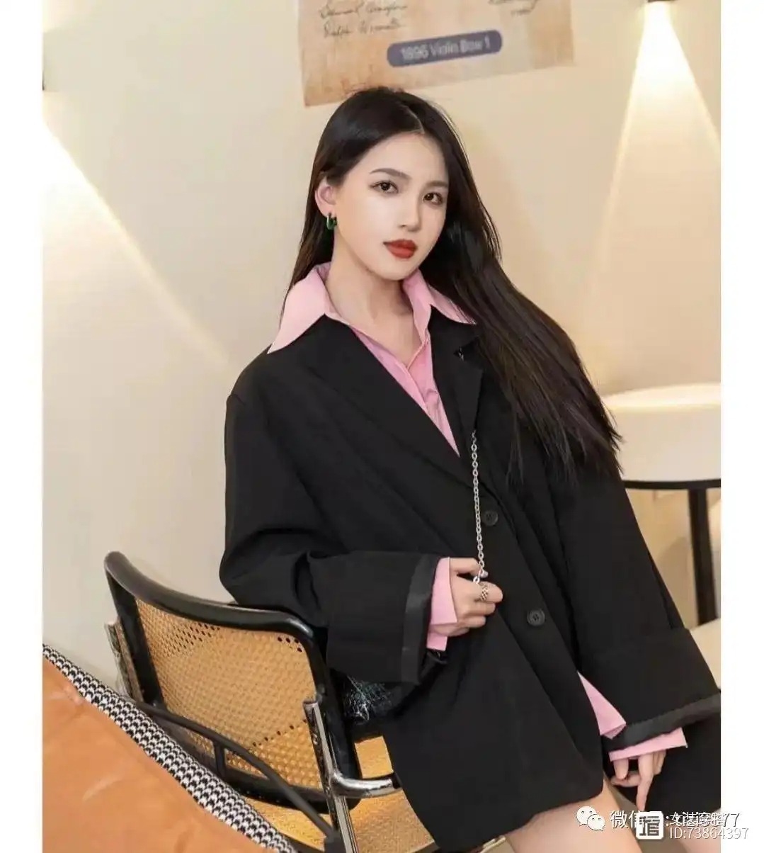 西装千千万,唯有黑色最耐看!基础款的黑色西装外套内搭粉色衬衫日常又好看,翻出衬衫的领子是精髓,戴了墨绿色耳环,更显精致。