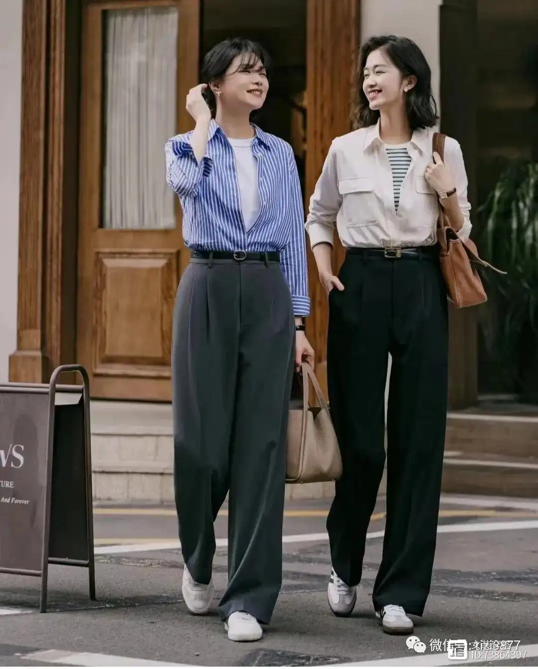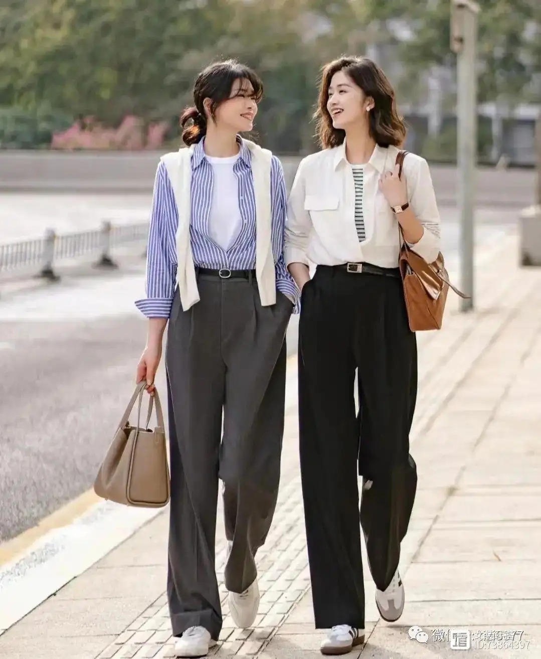 基础色+基础款的结合,衬衫和西装裤是在衣橱中穿着搭配率很高的单品,衬衫+内搭T恤+西装裤的搭配适合早春的舒适感。