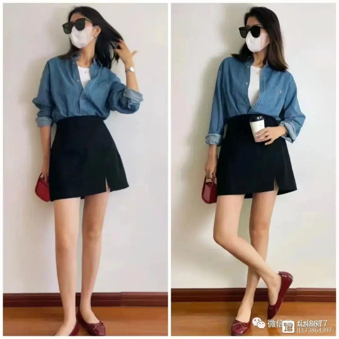 一套红蓝黑颜色的搭配,牛仔衬衫与白背心叠穿,下半身搭配黑色A字裙,时髦复古的法式穿搭,最后不要忘记搭配小红鞋,一整个法式氛围拿捏住。