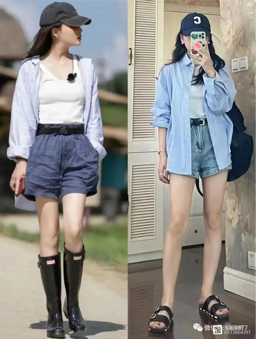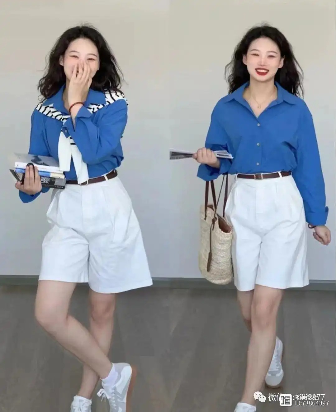 蓝白配色太清新啦!蓝白条衬衫+白色背心+蓝色短裤,这身好适合出游,实用又舒适,轻松简单又女人味十足。