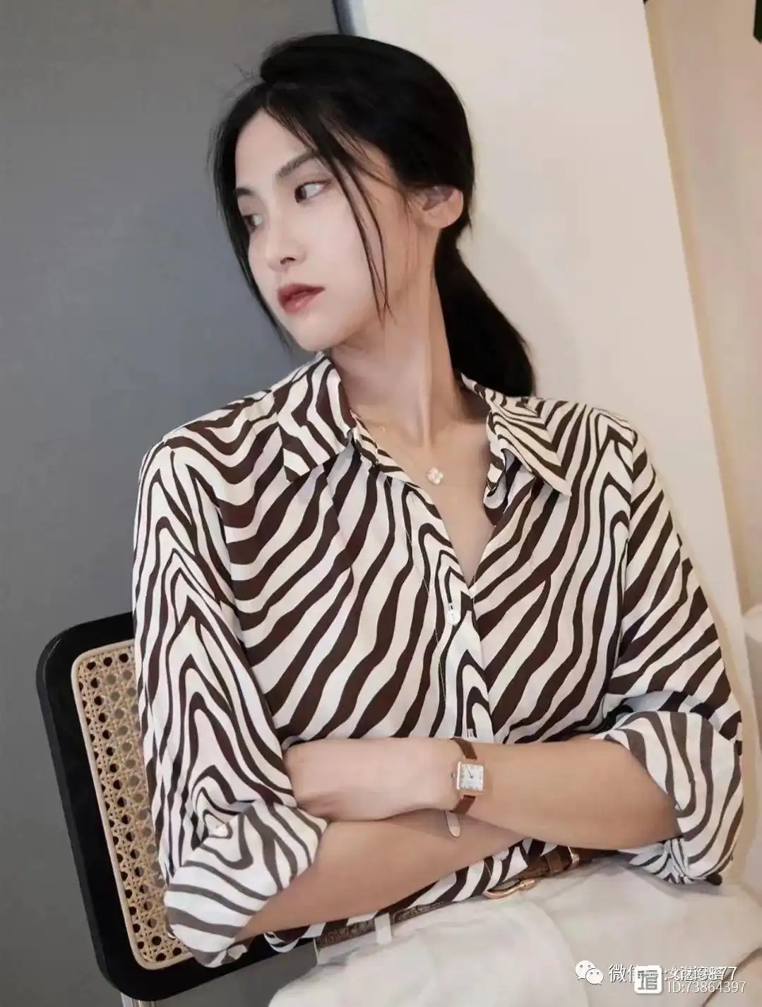 衬衫+西装中裤的搭配基本不出错,注意颜色和配饰这样的小细节就可以。手表表带和衬衫的色系一样,小小的方表盘非常精致,还有脖子上带小钻石的贝母项链,刚好和手表的贝母表盘呼应上。